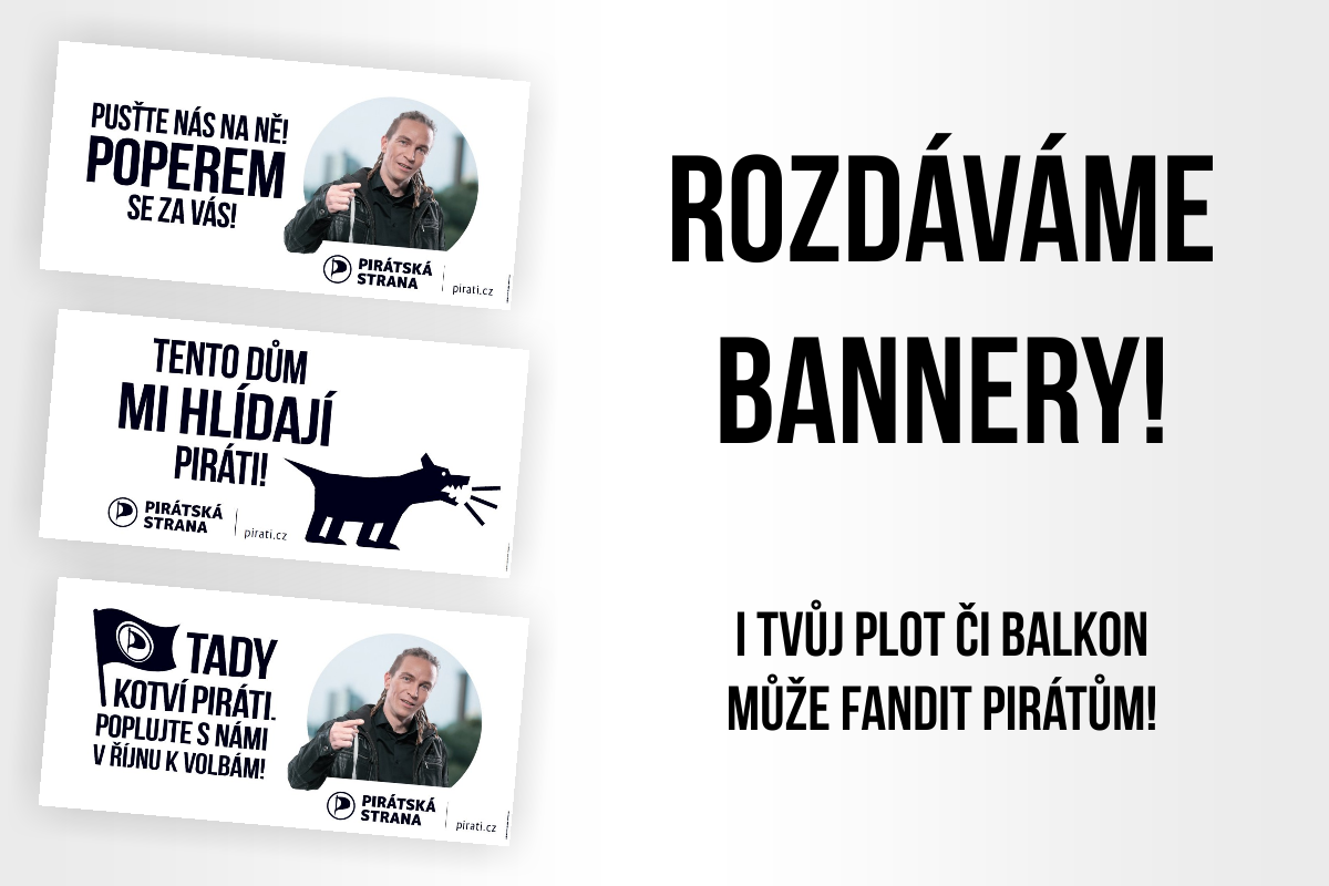 Dům, plot, či zábradlí. I tato místa mohou vyjádřit vaši podporu Pirátům, když na ně vyvěsíte náš baner. Banery jsou ve třech druzích v černobílém provedení o rozměrech 100 x 200 cm s kovovými oky po obvodu pro praktičtější uchycení.